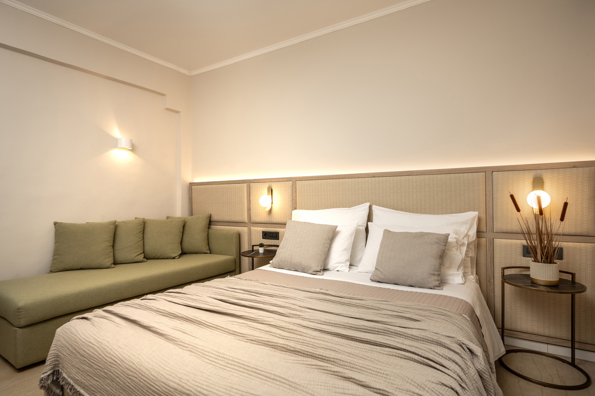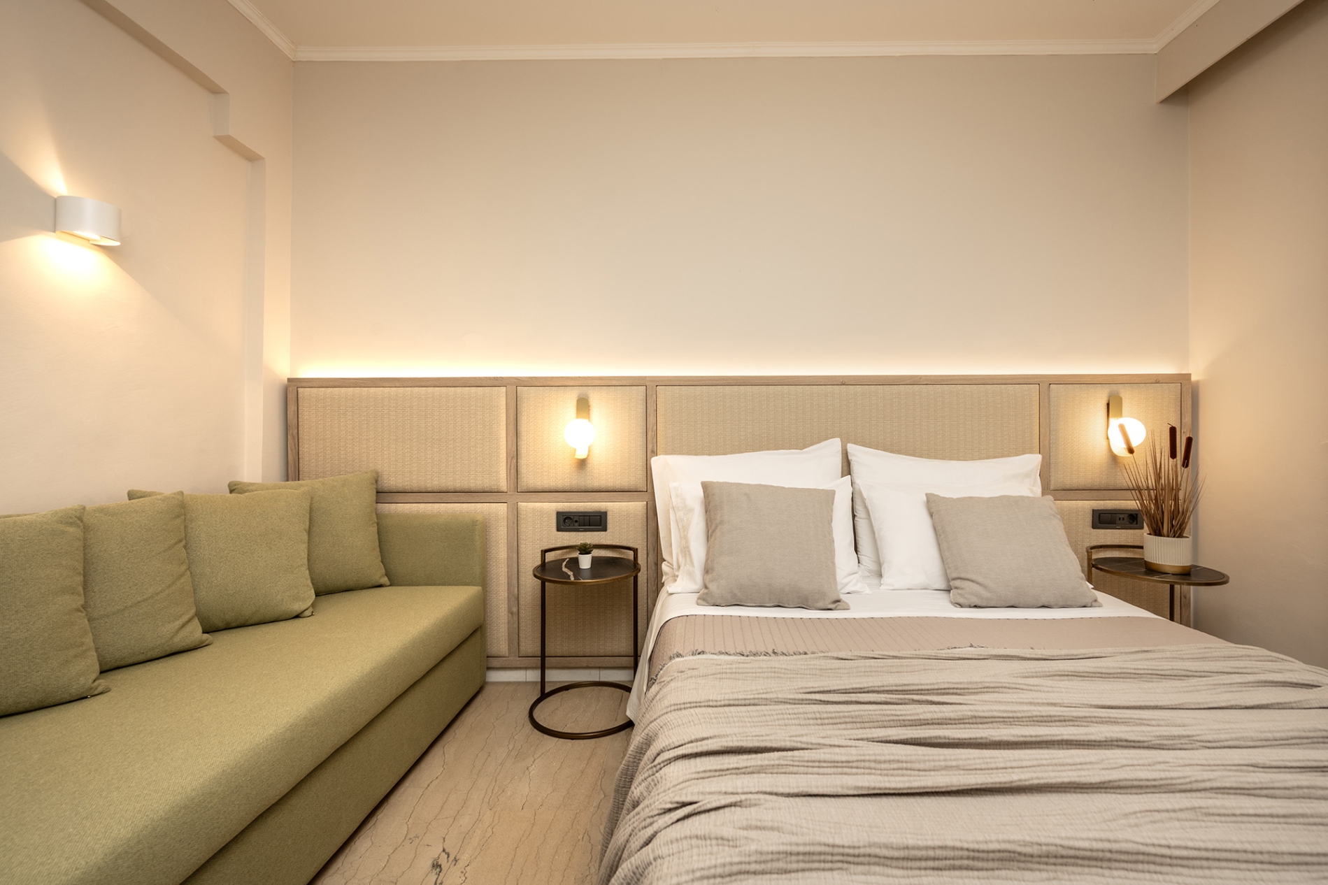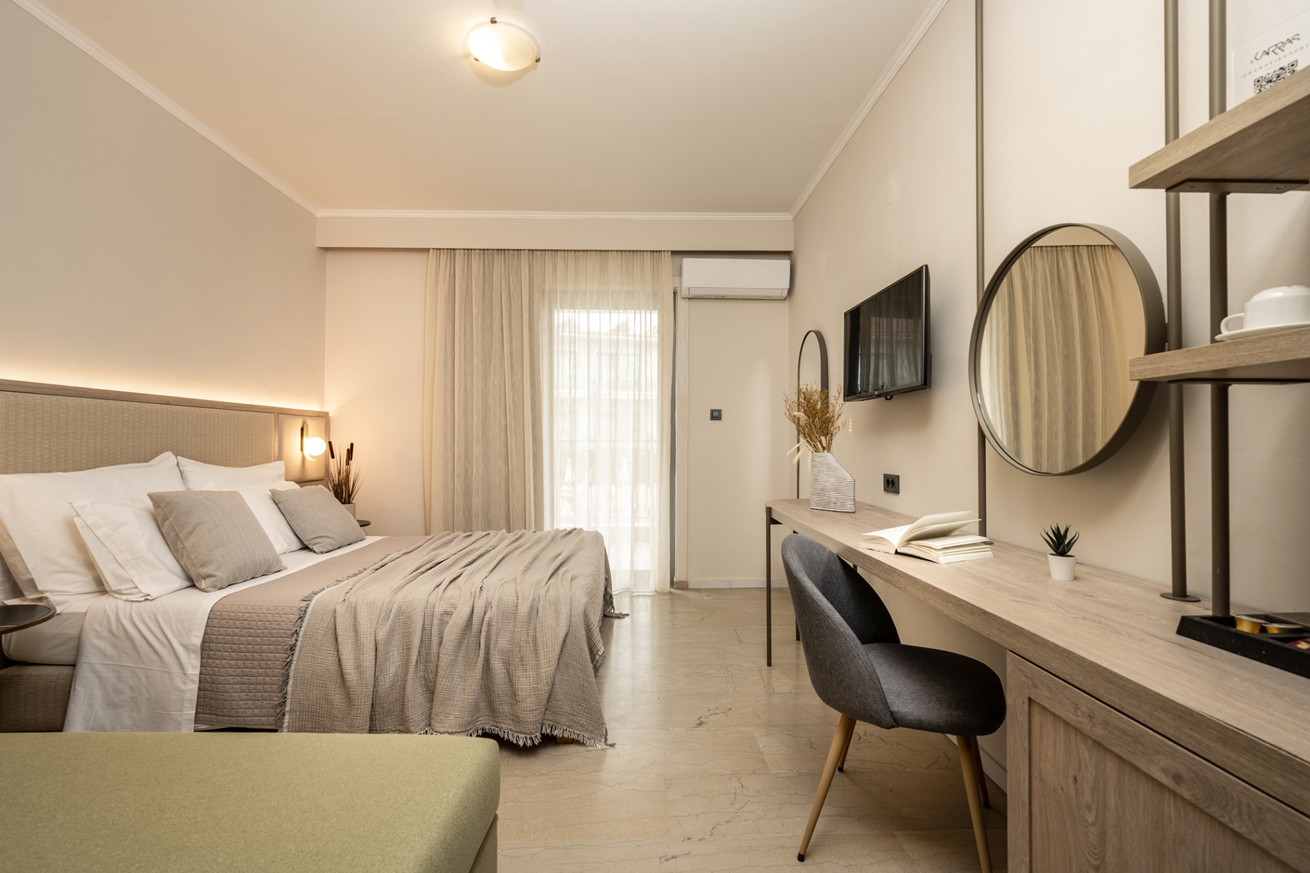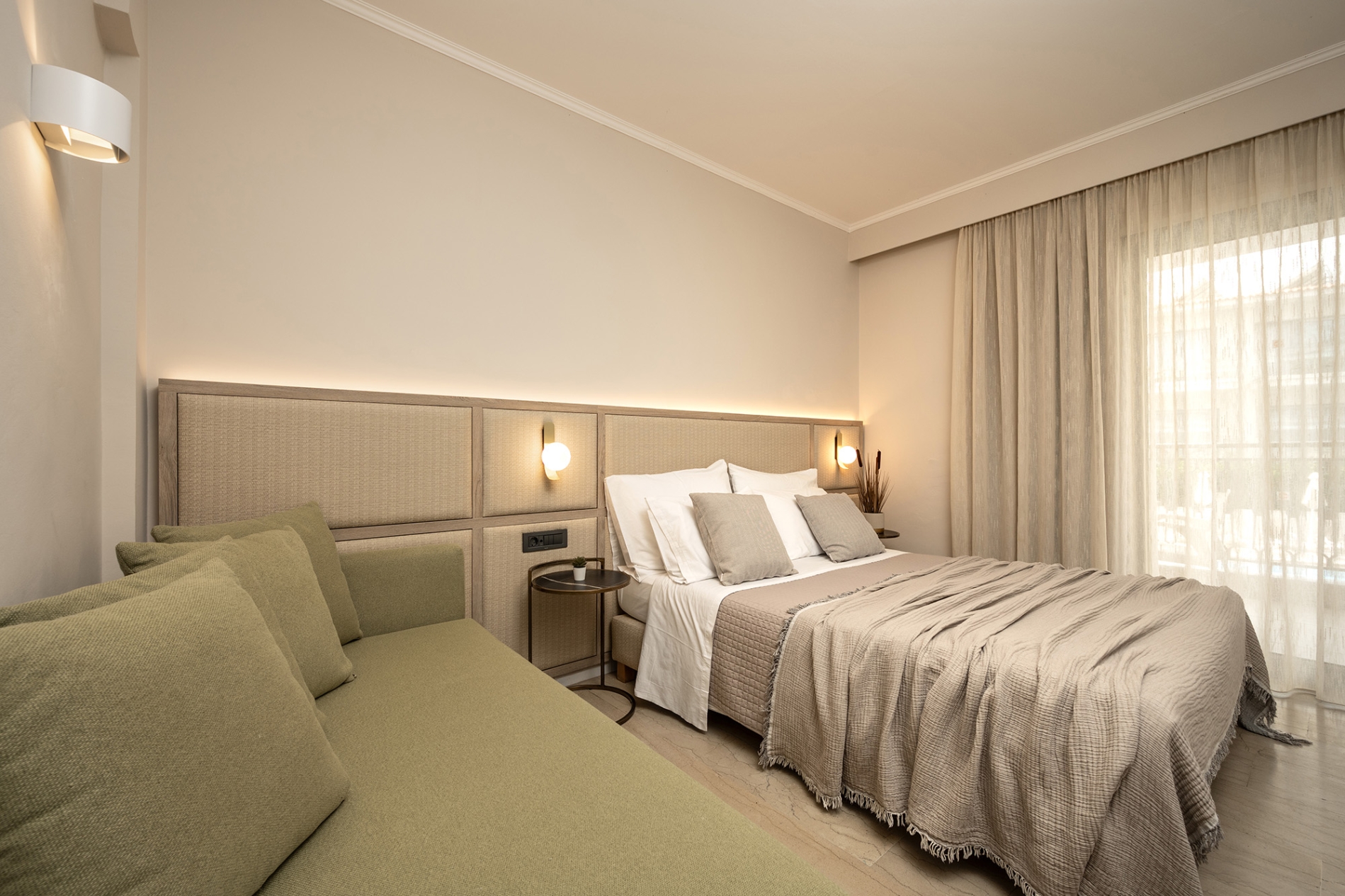 Ideal for small groups or families, this stylish 18 m² room accommodates up to three guests, featuring one double bed or two single beds, plus one sofa bed. Enjoy modern comforts, including air conditioning, a flat-screen TV, a mini-fridge and a private furnished balcony with relaxing pool views. Designed for comfort and tranquility, this room offers a peaceful retreat within the vibrant Karras Grande Resort.