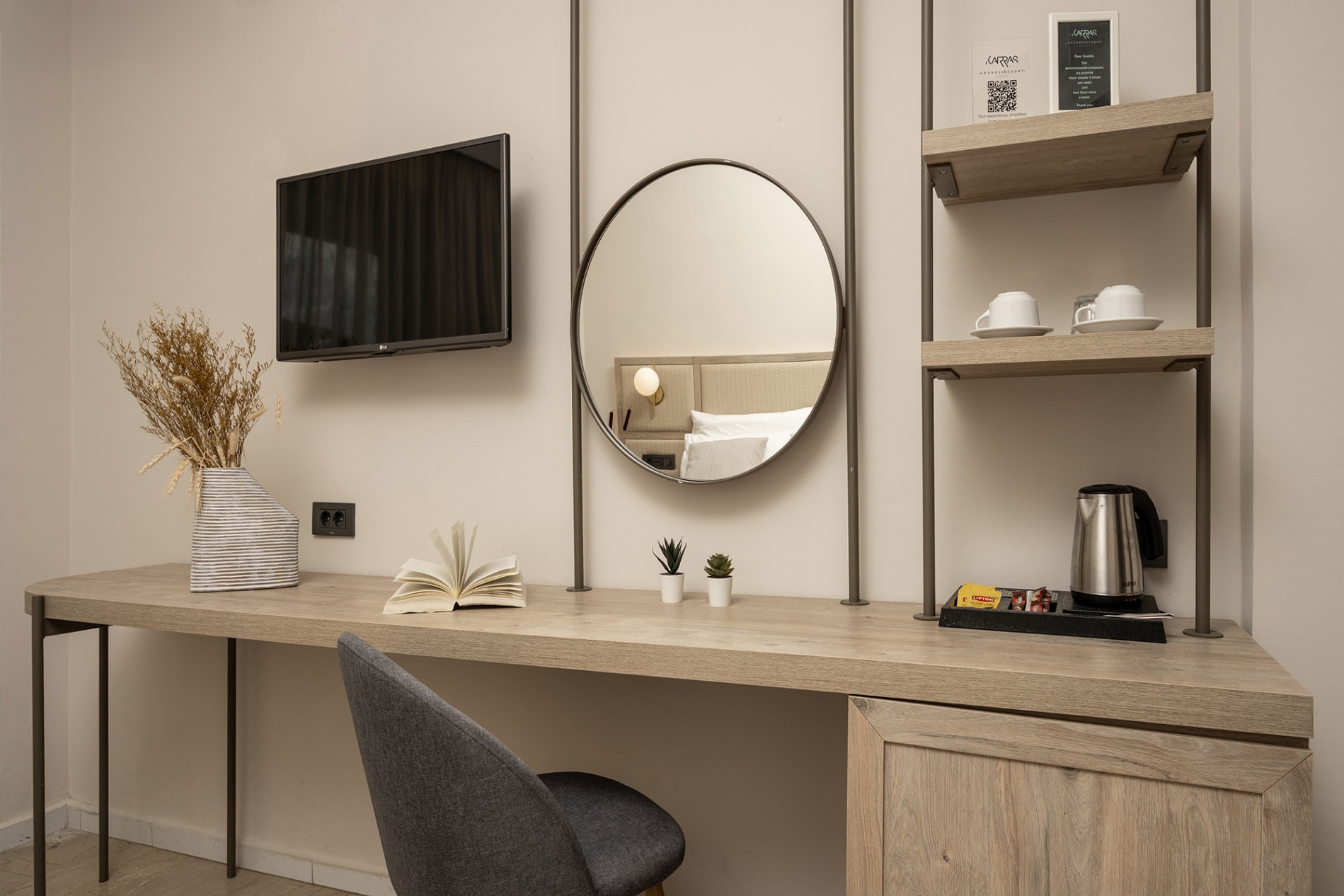 Απολαύστε μια χαλαρωτική διαμονή σε ένα κομψό και άνετο δωμάτιο 18τ.μ., ιδανικό για 2 άτομα. Είτε με ένα διπλό είτε με δύο μονά κρεβάτια, το δωμάτιο προσφέρει σύγχρονες ανέσεις, όπως κλιματισμό, τηλεόραση, μικρό ψυγείο καθώς και επιπλωμένο ιδιωτικό μπαλκόνι με θέα στην πισίνα. Προσεκτικά σχεδιασμένο και με μοντέρνα διακόσμηση, το δωμάτιο εξασφαλίζει ένα γαλήνιο καταφύγιο στο πολυσύχναστο περιβάλλον του Karras Grande Resort.